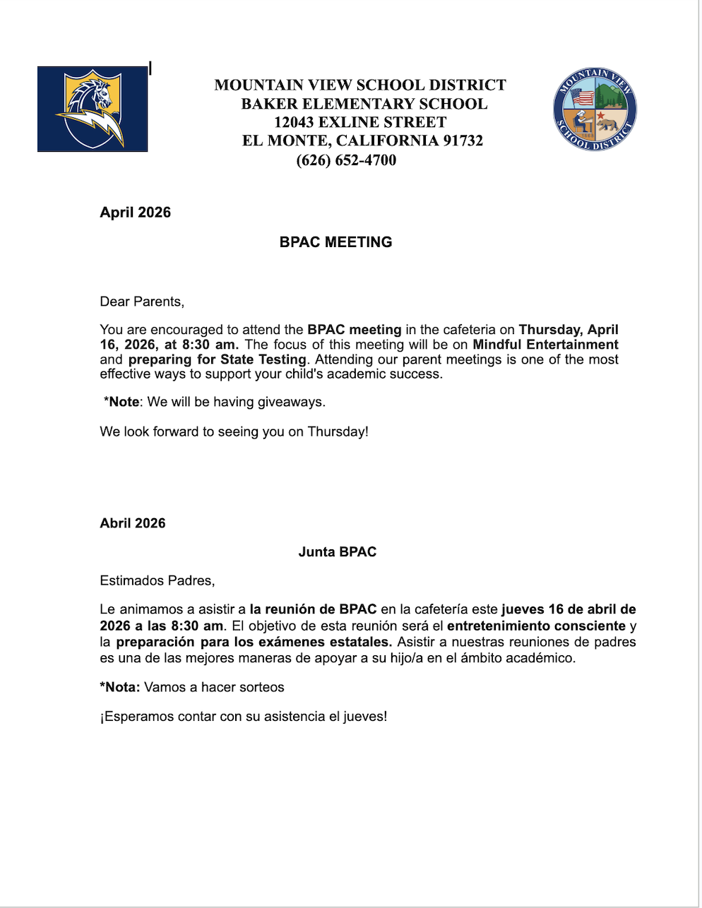 Good afternoon families, Please join us tomorrow, April 16, 2026, for our monthly BPAC/ELAC meeting. It will start at 8:30 am in our cafeteria. We will be having a giveaway and raffles for those in...