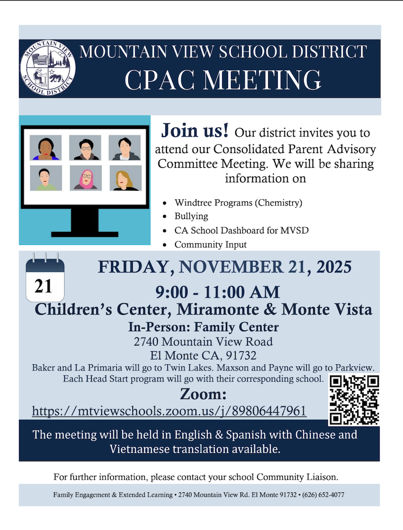 Meeting Announcement Tuesday, November 18, 2025 9:00 A.M. - 11:00 A.M. All MVSD parent and family member are cordially invited to attend our next scheduled District English Learner Advis. . .