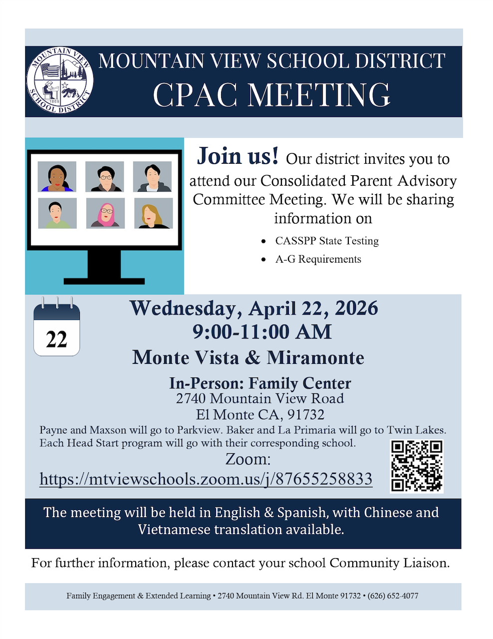 Hello families, We have our last CPAC meeting happening tomorrow, April 22, starting at 9:00 am. This meeting will be held at Twin Lakes School. Transportation will be provided for those who need i...