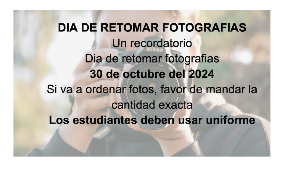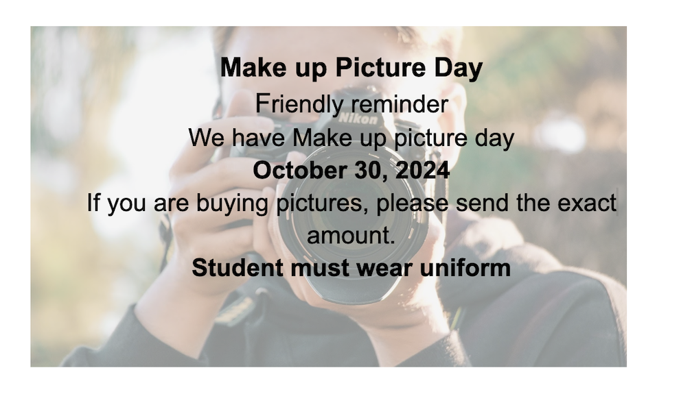 On Wednesday, October 30, we will be having our make-up picture day for those who did not take them the first time. Forms are available in the office. Students need to wear uniform.