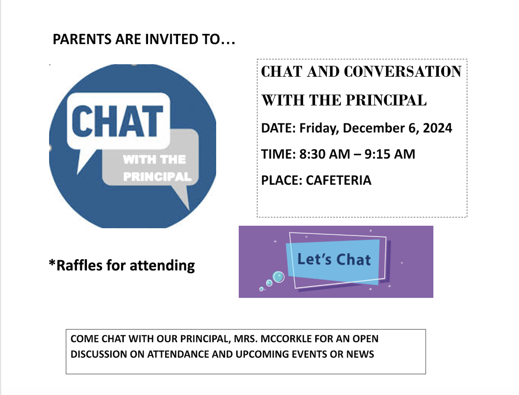 Join us this FRIDAY, DECEMBER 6TH at 8:30am to chat with our wonderful principal, Mrs. McCorkle. We will be discussing attendance, upcoming events and news. Raffles for attending! We cant wait to see you on Friday morning.
