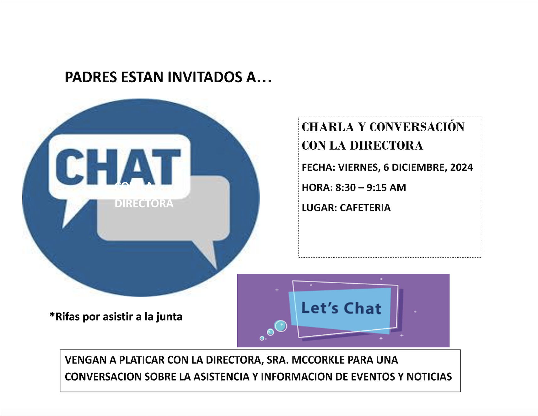 Únase a nosotros este VIERNES, 6 de DICIEMBRE a las 8:30 am para charlar con nuestra maravillosa directora, la D.ª McCorkle. Discutiremos la asistencia, los próximos eventos y noticias. ¡Raffles por asistir! No podemos esperar a verte el viernes por la mañana.