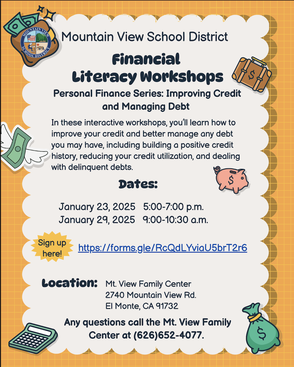 We are excited to share that we will have 2 upcoming workshops on Financial Literacy!! Come learn how to improve your credit score, better manage any debt you may have, build a positive credit history, reduce your credit utilization and dealing with delinquent debts. Register on the link below or the link on the flyer