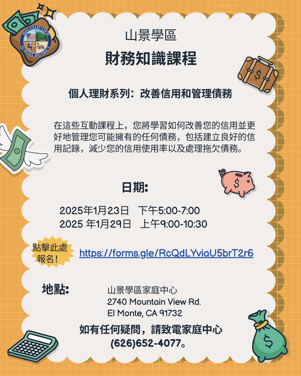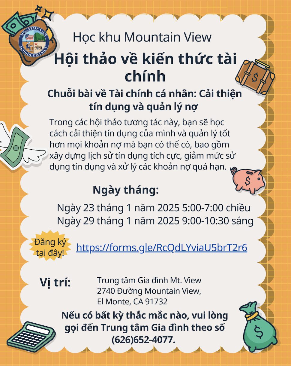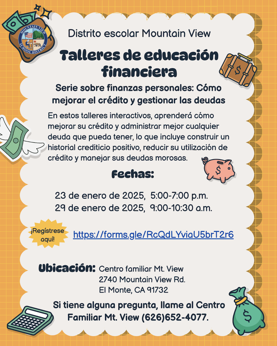 Estamos muy contentos de compartir que tendremos 2 próximos talleres sobre Educación Financiera!! Venga a aprender cómo mejorar su puntaje de crédito, manejar mejor cualquier deuda que pueda tener, construir un historial de crédito positivo, reducir su utilización de crédito y lidiar con deudas morosas. Regístrese en el enlace de abajo o en el enlace en el folleto