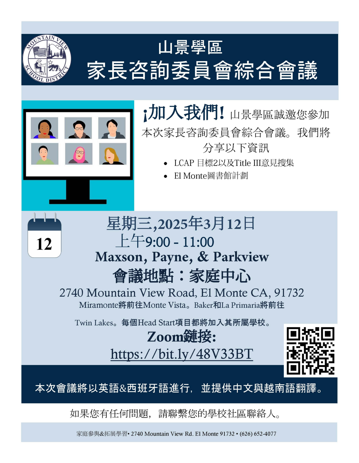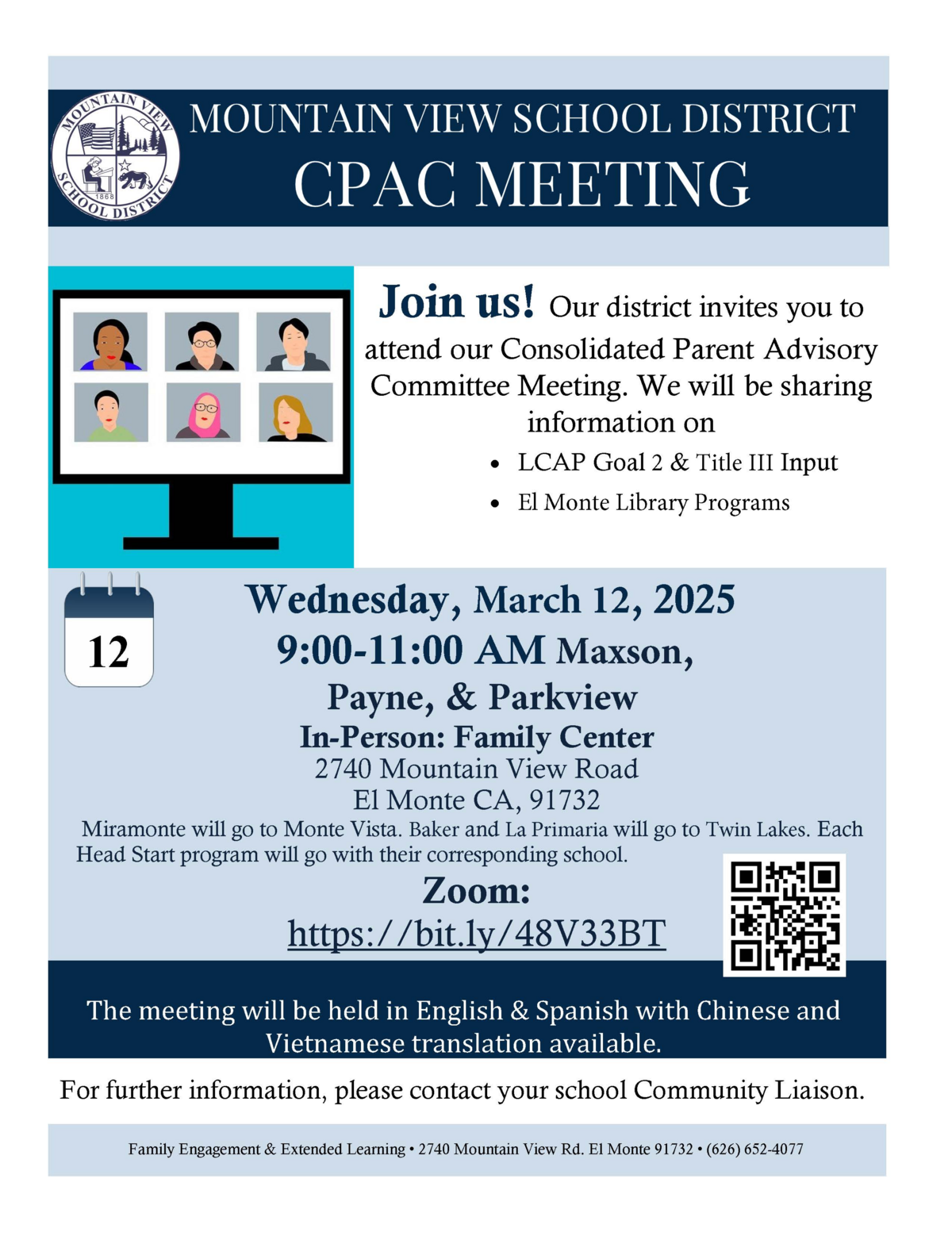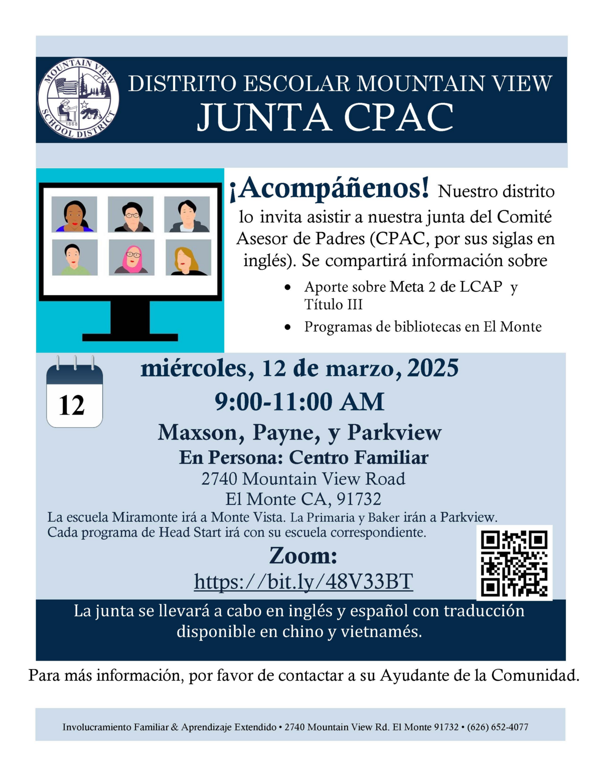 We would like to invite you to our CPAC Meeting on Wednesday, March 12, 2025 from 9:00-11:00 a.m. We will have presentations on LCAP Goal 2, Title III input, and the El Monte Library programs. The meeting will be held at Twin Lakes. You can also join through zoom by clicking the link down below. Transportation will be provided. For those families in attendance, their student will receive a wristband for free dress, be enter to a raffle and a special treat.